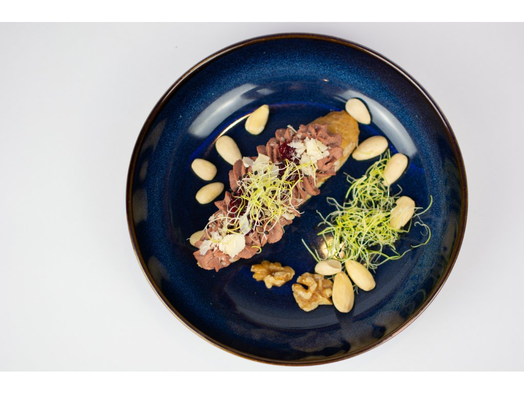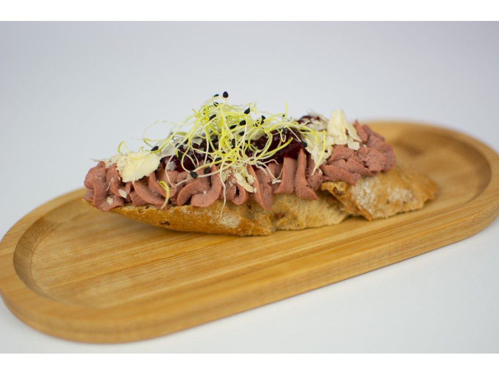 Drůběží paštika na cibulové bagetce s brusinkou a mandlemi