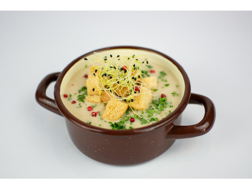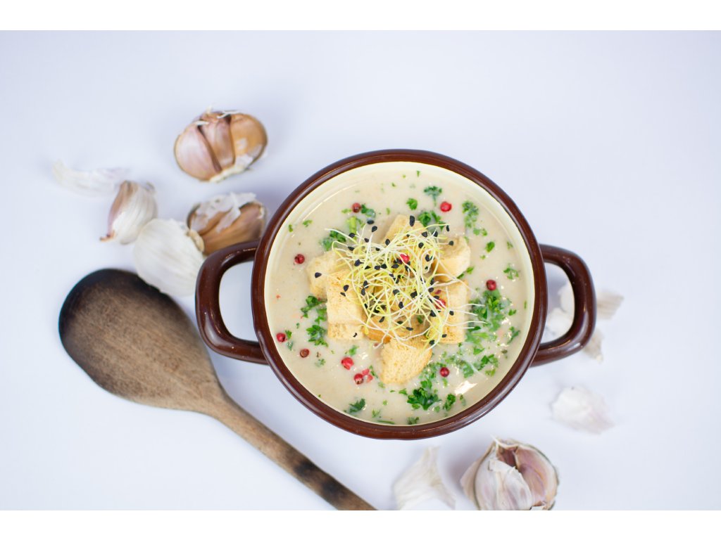 Krémová česneková polévka z pečeného česneku se slaninou a krutóny