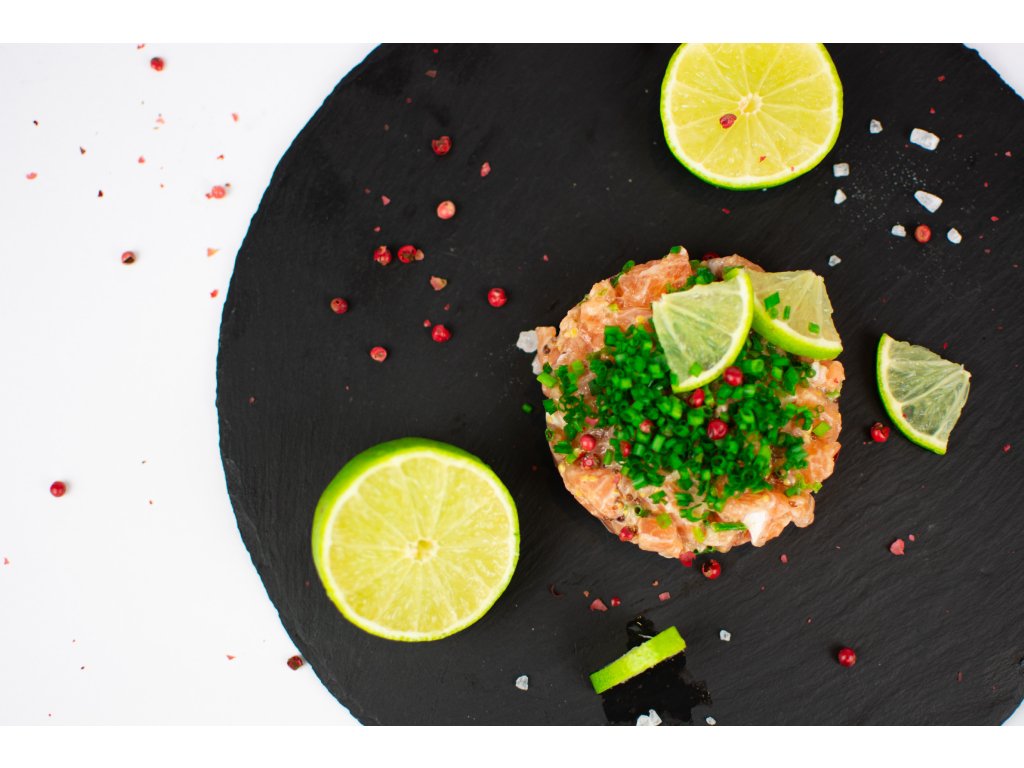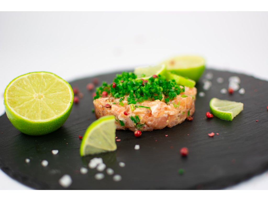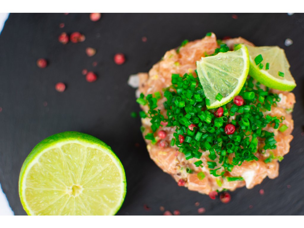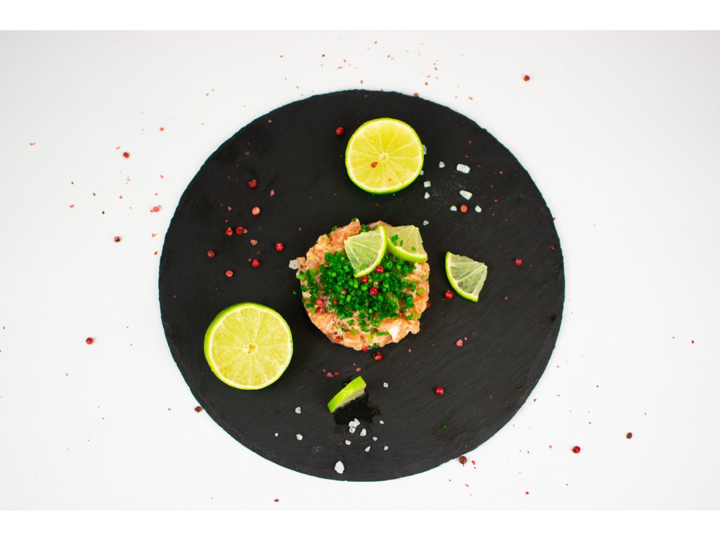 Lososový tataráček s čerstvým koprem zakápnutý limetkou podávaný s toastem