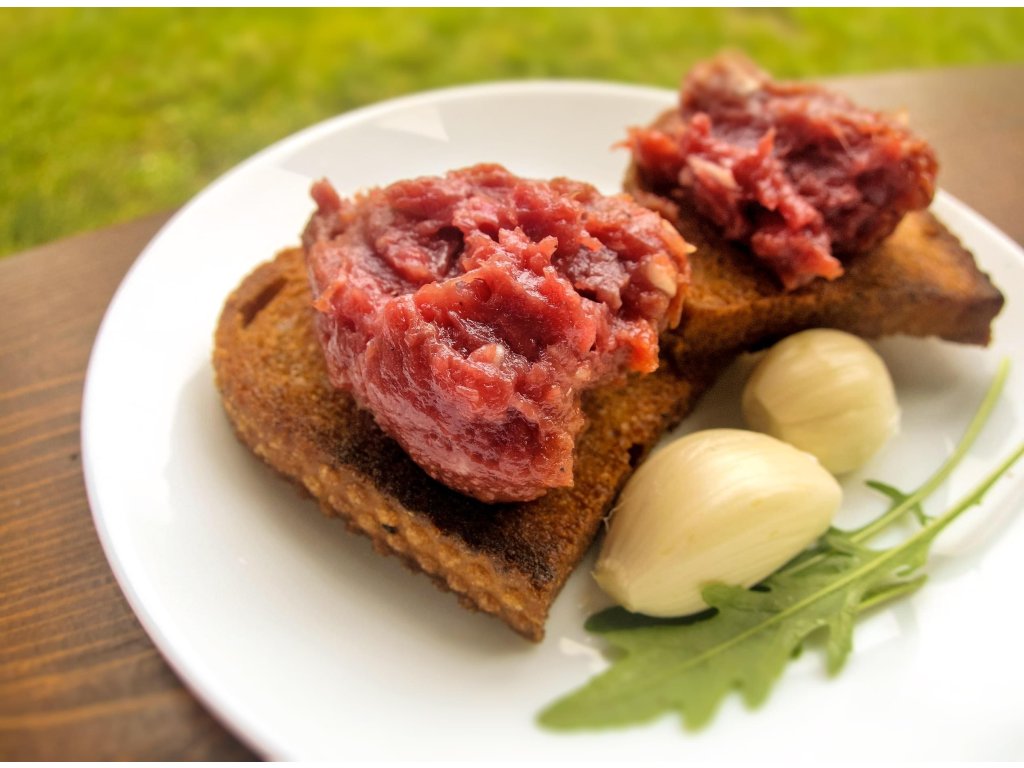 Název: Tatarák z falešné hovězí svíčkové s česnekem, variací červené a bílé cibule, kozími rohy a topinkami (1 kg)