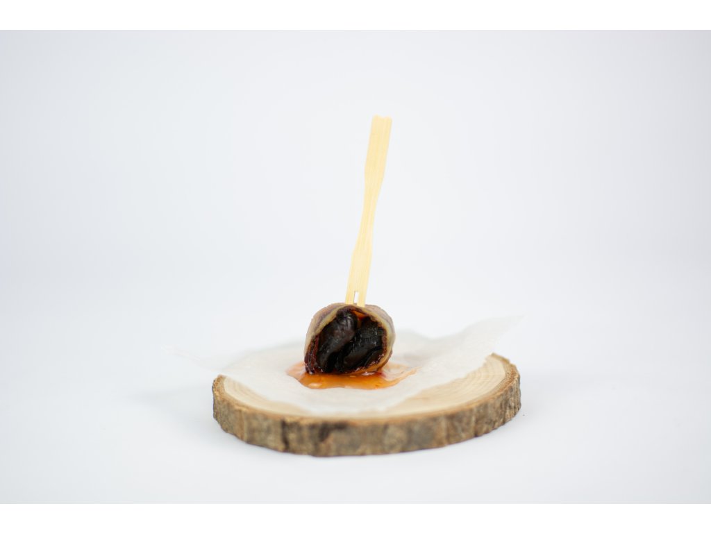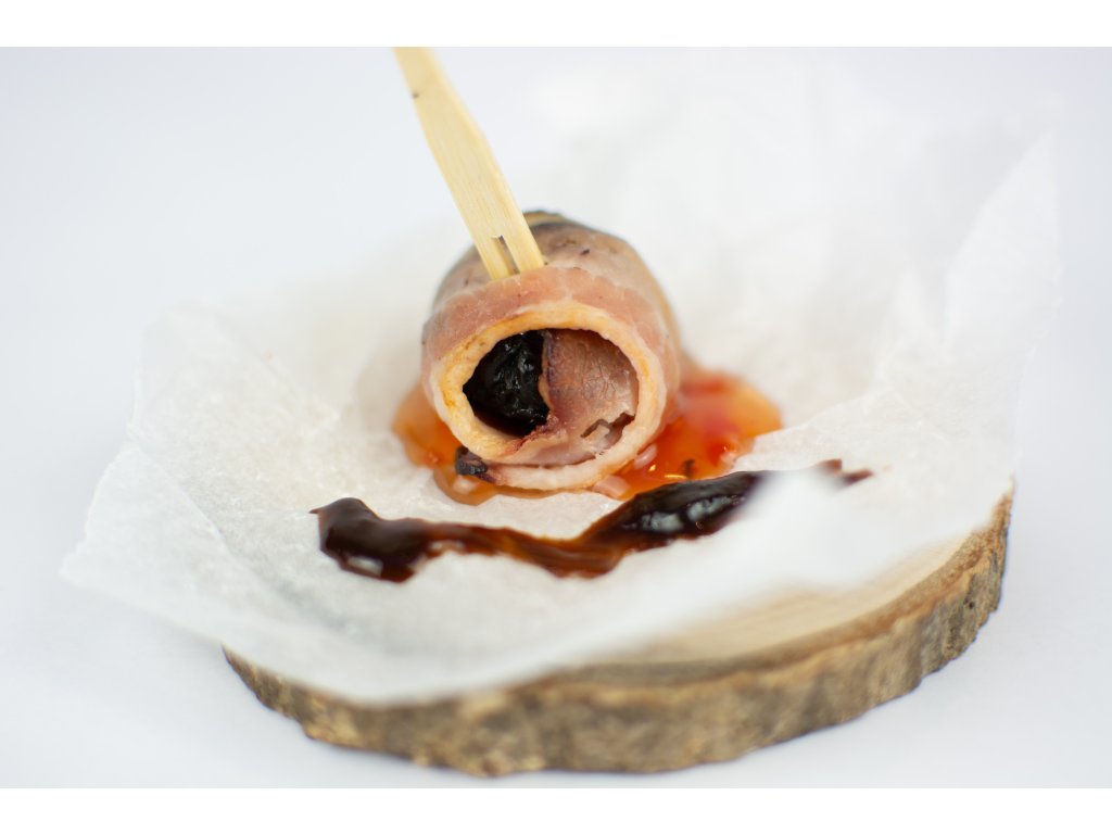 Švestka ve slanince na sladkém thai pyré a povidlovým dipem (Finger)