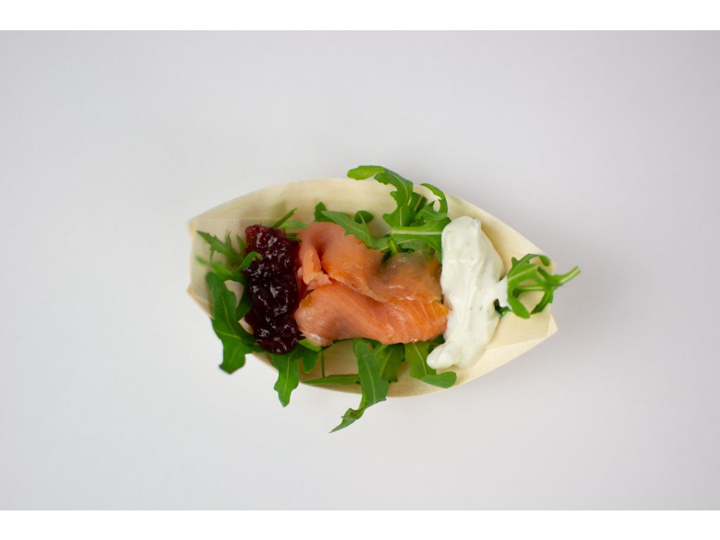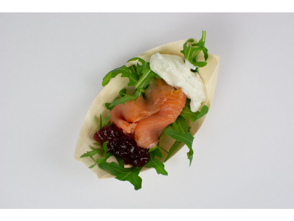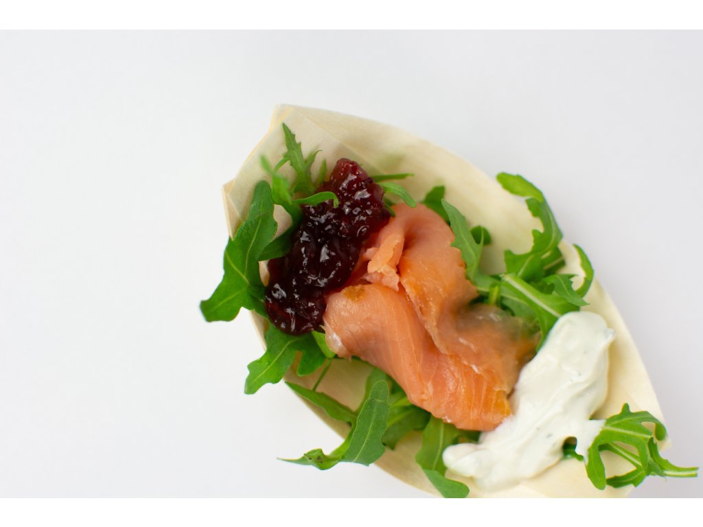 Uzený losos na rukole s koprovým přelivem a brusinkama (Finger)