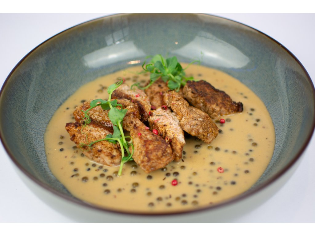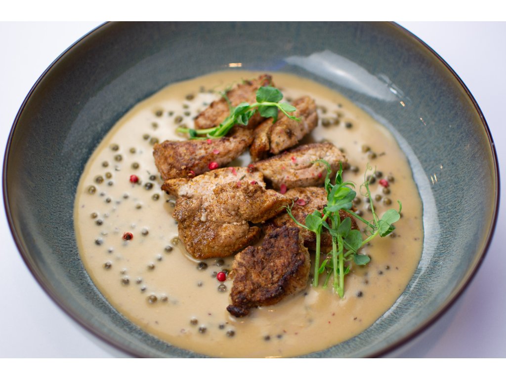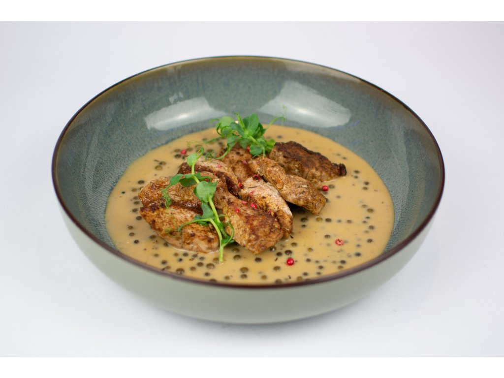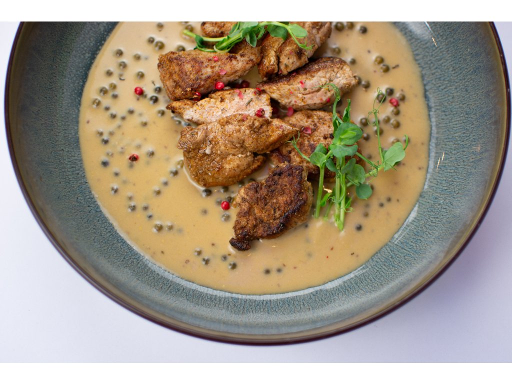 Vepřové ministeaky ve smetanové omáčce se zeleným pepřem z vepřové panenky
